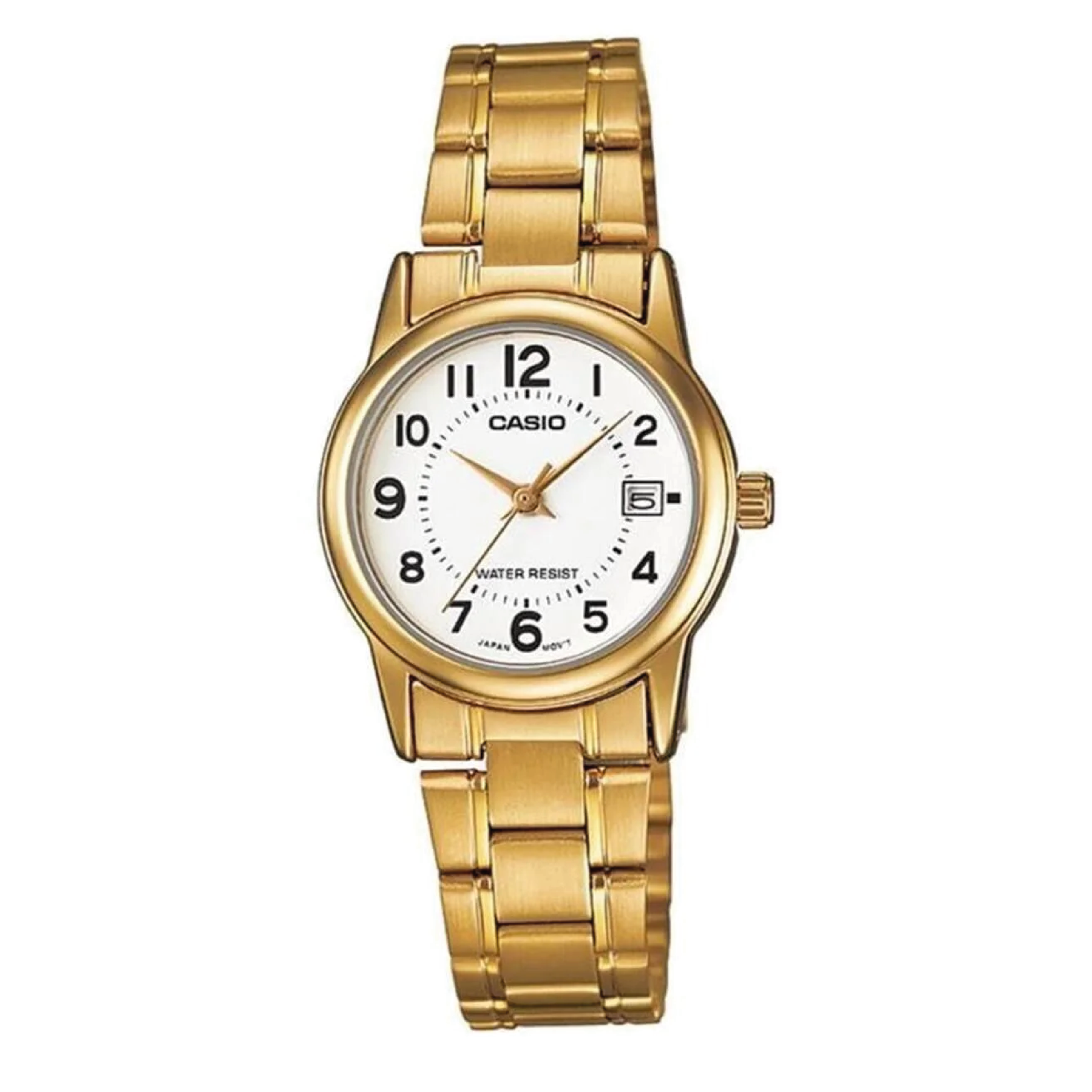 El Casio LTP-V002G-7B es una pieza que equilibra perfectamente el brillo del oro con la utilidad diaria. Su diseño destaca por una caja y correa con baño de iones dorados, que envuelven una esfera blanca limpia y minimalista. Es un reloj que comunica orden, puntualidad y una atención impecable a los detalles.