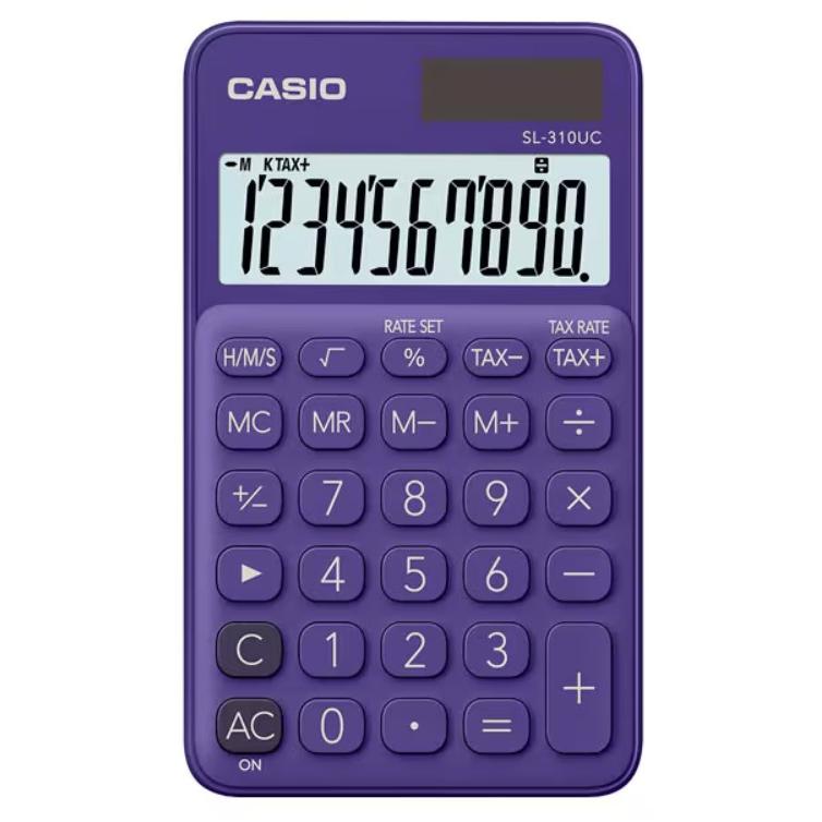 💜 Calculadora Casio SL-310UC púrpura, 10 dígitos. Diseño elegante con pantalla grande y teclas cómodas.