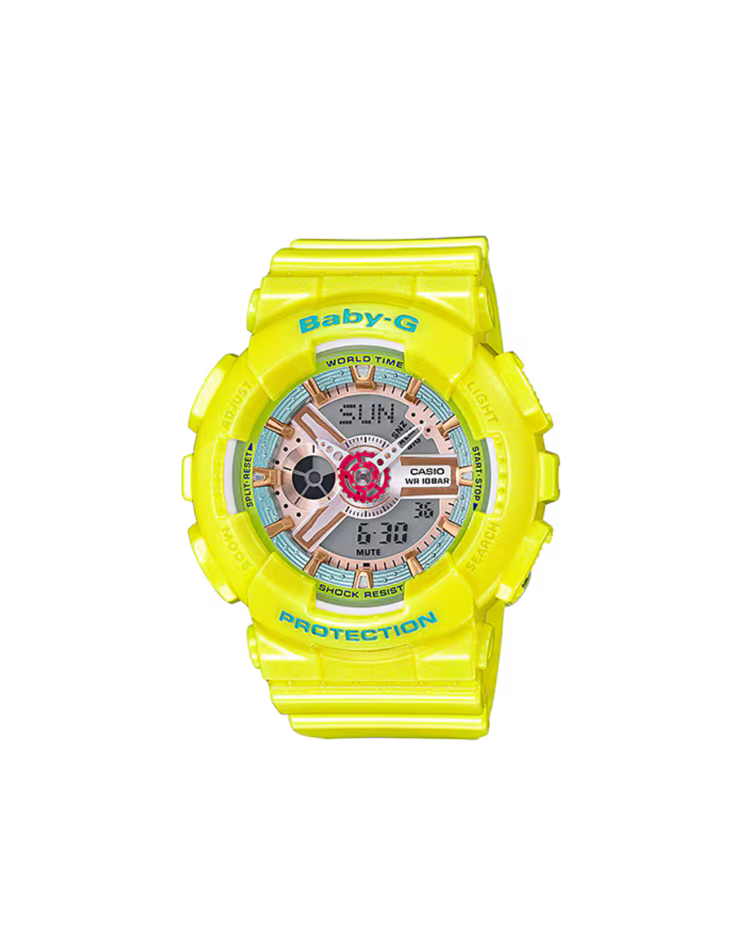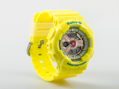 El Casio Baby-G BA-110CA-9A presenta un diseño deportivo en tono amarillo pastel con acabados modernos que le aportan un estilo fresco y versátil. Su dial multidimensional con detalles metálicos crea una apariencia dinámica y con profundidad visual, adaptándose a diferentes estilos urbanos y casuales.