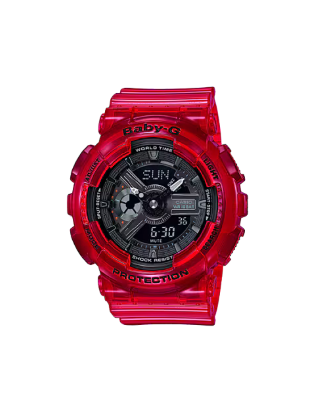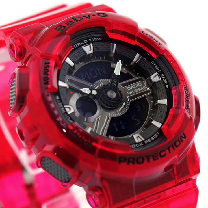 El Casio Baby-G BA-110CR-4A presenta un diseño deportivo en tono rojo coral semitransparente que le aporta un estilo moderno y llamativo. Su dial multidimensional, inspirado en engranajes mecánicos, crea una apariencia dinámica con profundidad visual y una estética contemporánea.