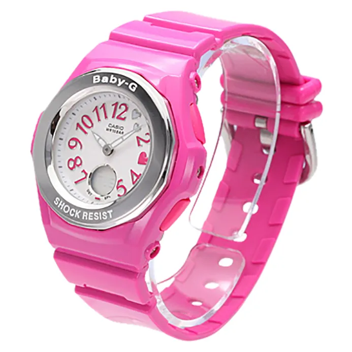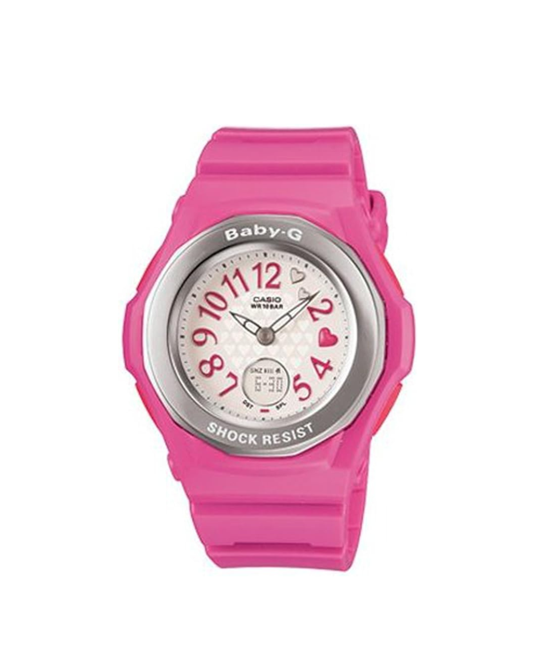 El Casio Baby-G BGA-105-4B presenta un diseño deportivo en tono rosado con detalles modernos que le aportan un estilo juvenil y llamativo. Su formato combina una esfera analógica con pantalla digital, integrando un diseño dinámico que mantiene una estética urbana y funcional.