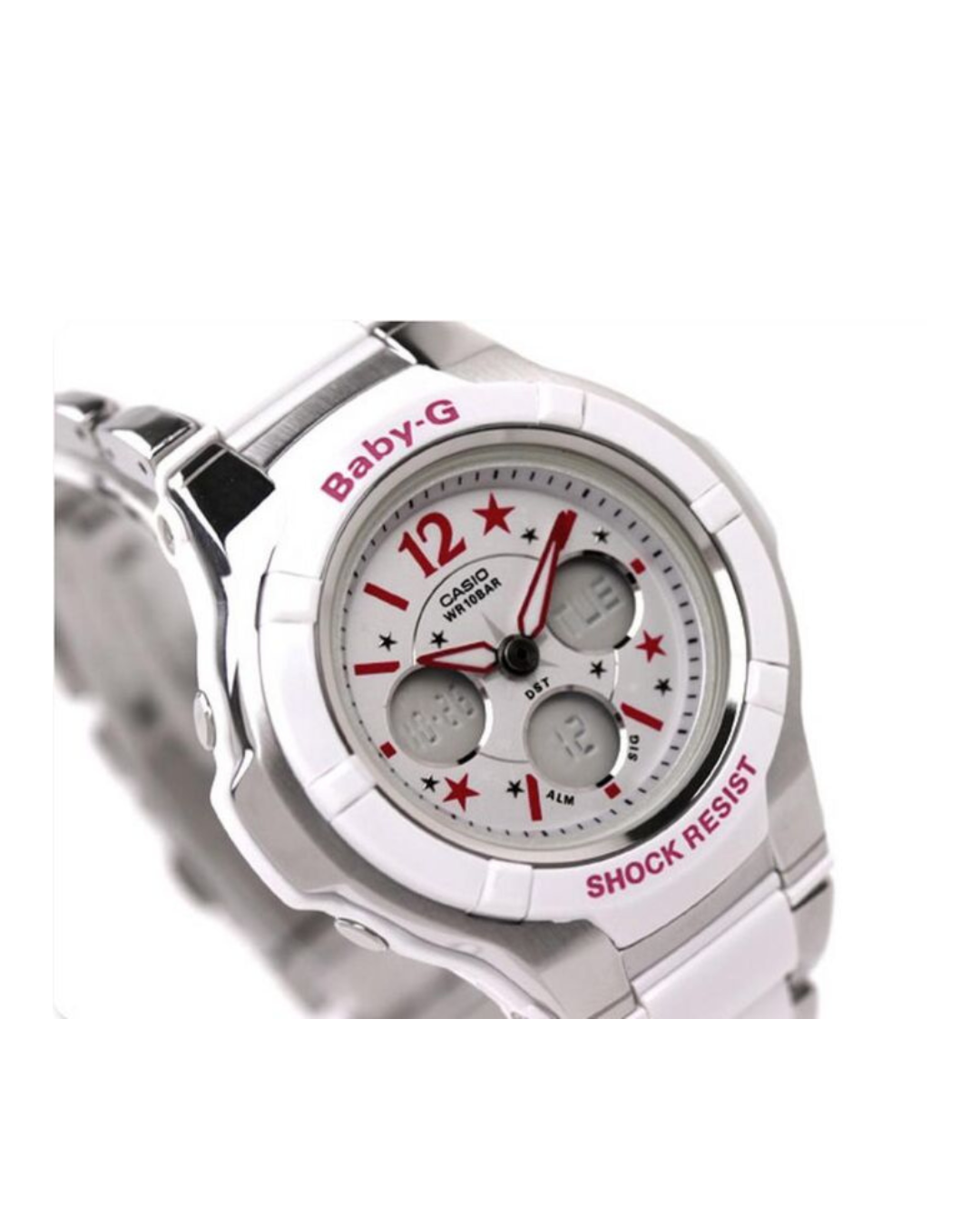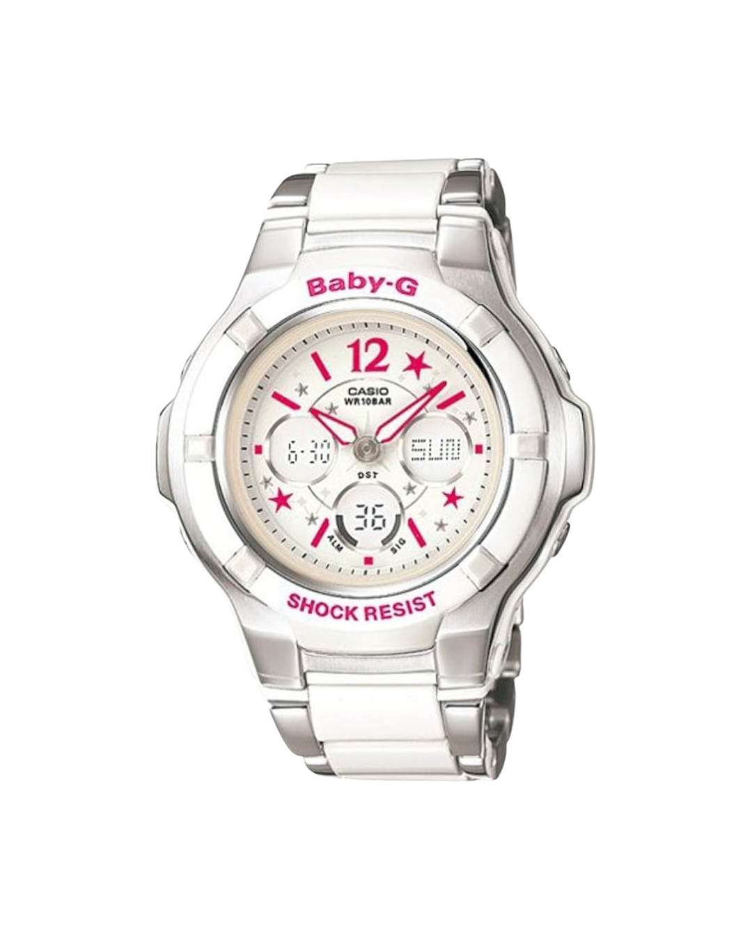 El Casio Baby-G BGA-120C-7B2 presenta un diseño deportivo en color blanco con detalles en tonos suaves que le aportan un estilo moderno y femenino. Su dial combina manecillas analógicas con pantalla digital en una composición dinámica, incorporando además sutiles elementos decorativos que se reflejan con la luz.