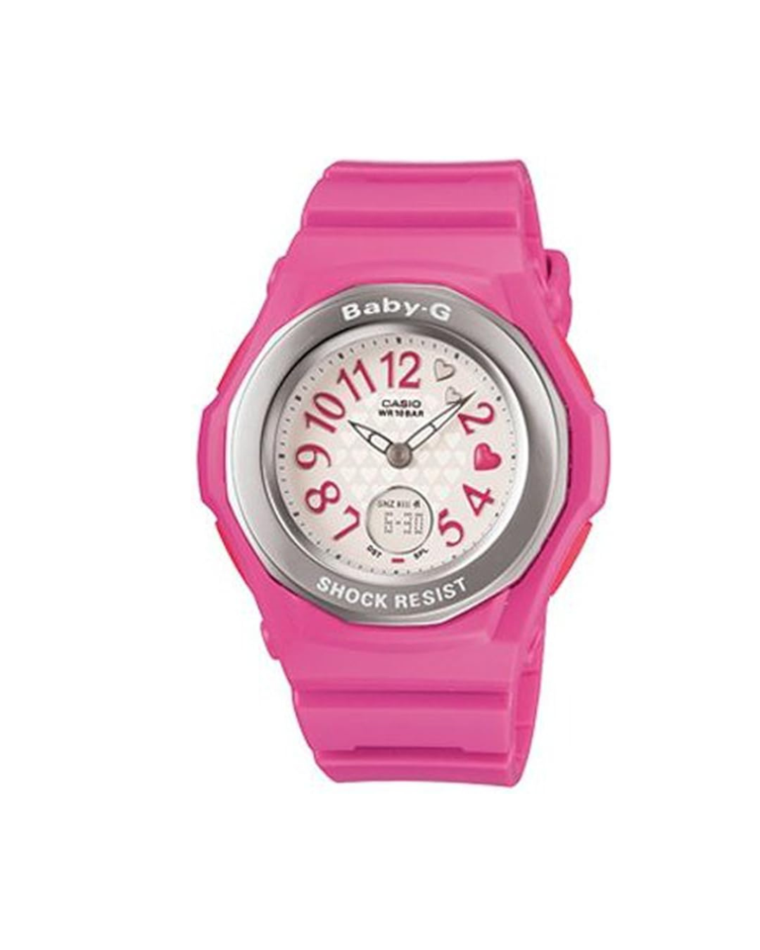 El Casio Baby-G BGA-131-4B3 presenta un diseño deportivo en tono rosado vibrante con detalles en contraste que le aportan un estilo juvenil y llamativo. Su dial multidimensional incorpora números en capas con efecto visual dinámico, complementado por iluminación tipo neon que resalta los detalles en condiciones de baja luz.