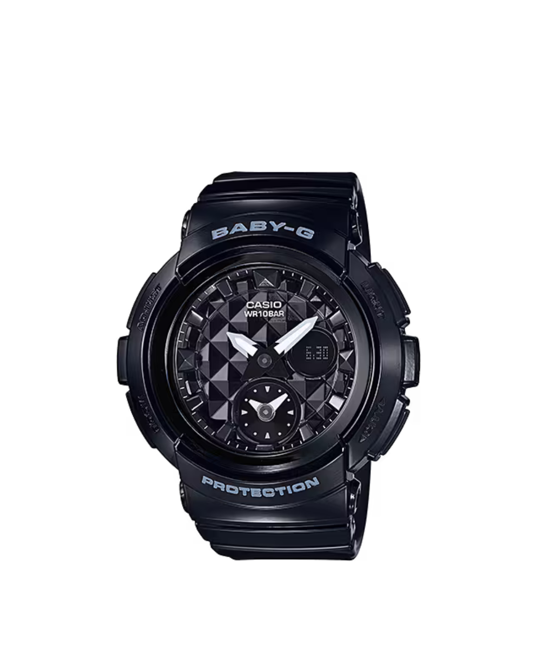 El Casio Baby-G BGA-195-1A presenta un diseño deportivo en color negro con acabado brillante y detalles inspirados en remaches metálicos, aportando un estilo moderno con un toque urbano elegante. Su dial combina manecillas analógicas con un subdial de hora mundial que añade profundidad visual y funcionalidad en un formato dinámico.