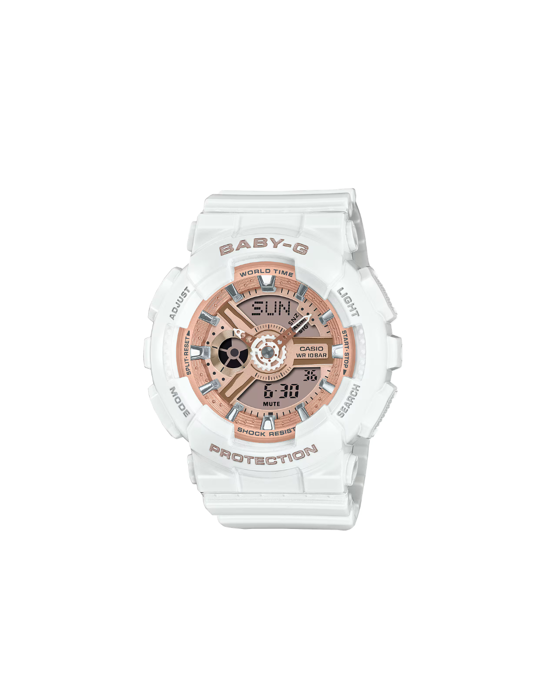 El Casio Baby-G BA-110X-7A1 presenta un diseño deportivo en color blanco con detalles metálicos sutiles que le aportan un estilo moderno, limpio y elegante. Inspirado en la línea G-SHOCK, su dial multidimensional con efecto de engranajes crea una apariencia dinámica y con gran profundidad visual.