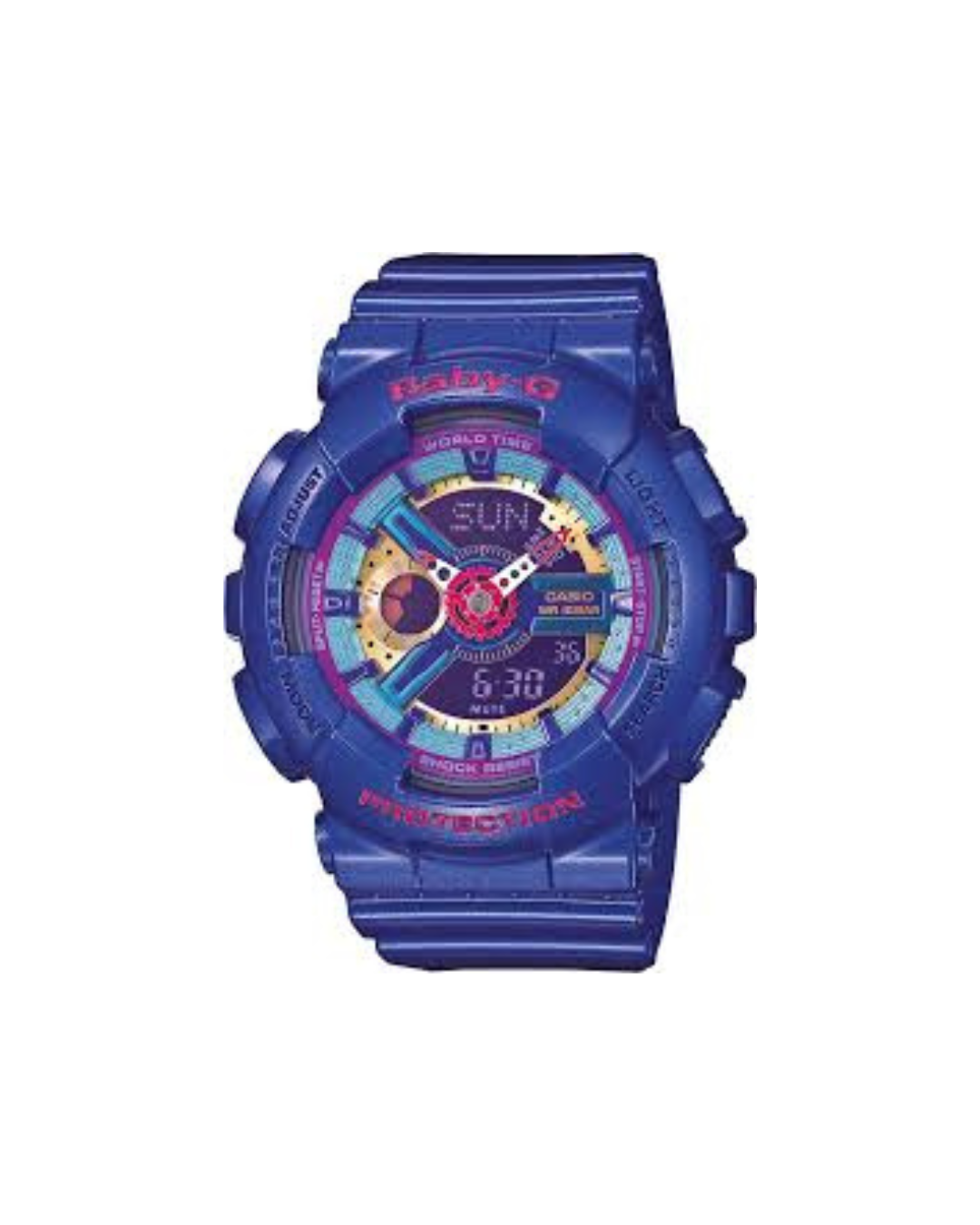 El Casio Baby-G BA-112-2A presenta un diseño deportivo en tono azul con detalles en contraste que le aportan un estilo moderno y dinámico. Su dial tridimensional, inspirado en la estética mecánica de la línea G-SHOCK, genera una apariencia visual compleja y llamativa, ideal para un look urbano.