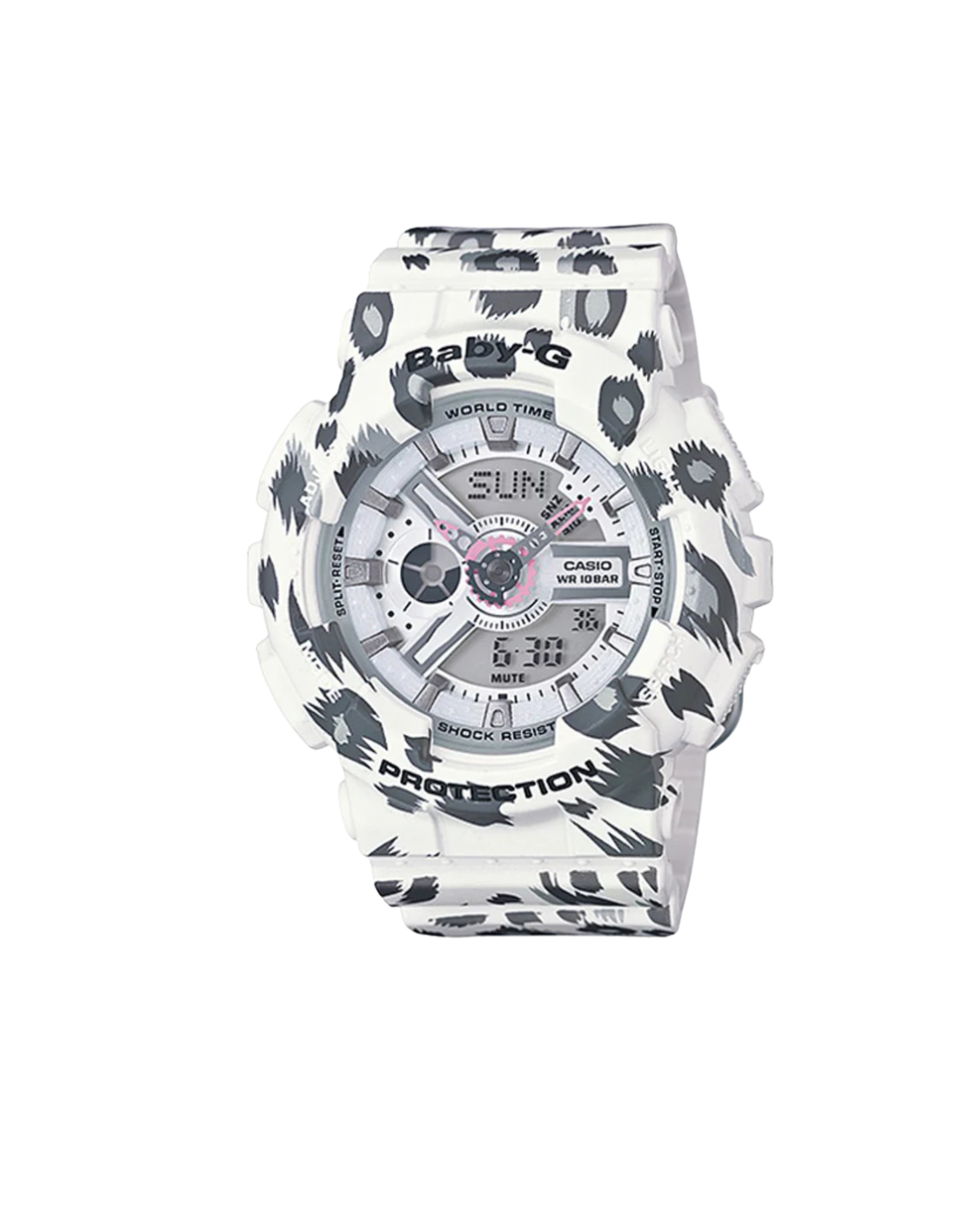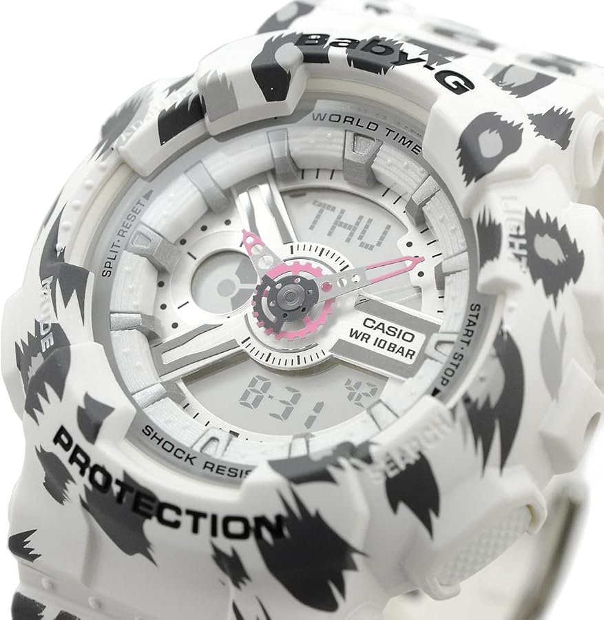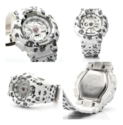 El Casio Baby-G BA-110LP-7A presenta un diseño deportivo en color blanco con un patrón inspirado en estilo animal print que le aporta un look moderno y llamativo dentro de la moda urbana. Su dial multidimensional, compuesto por elementos tipo engranaje, genera una apariencia dinámica y con profundidad visual.