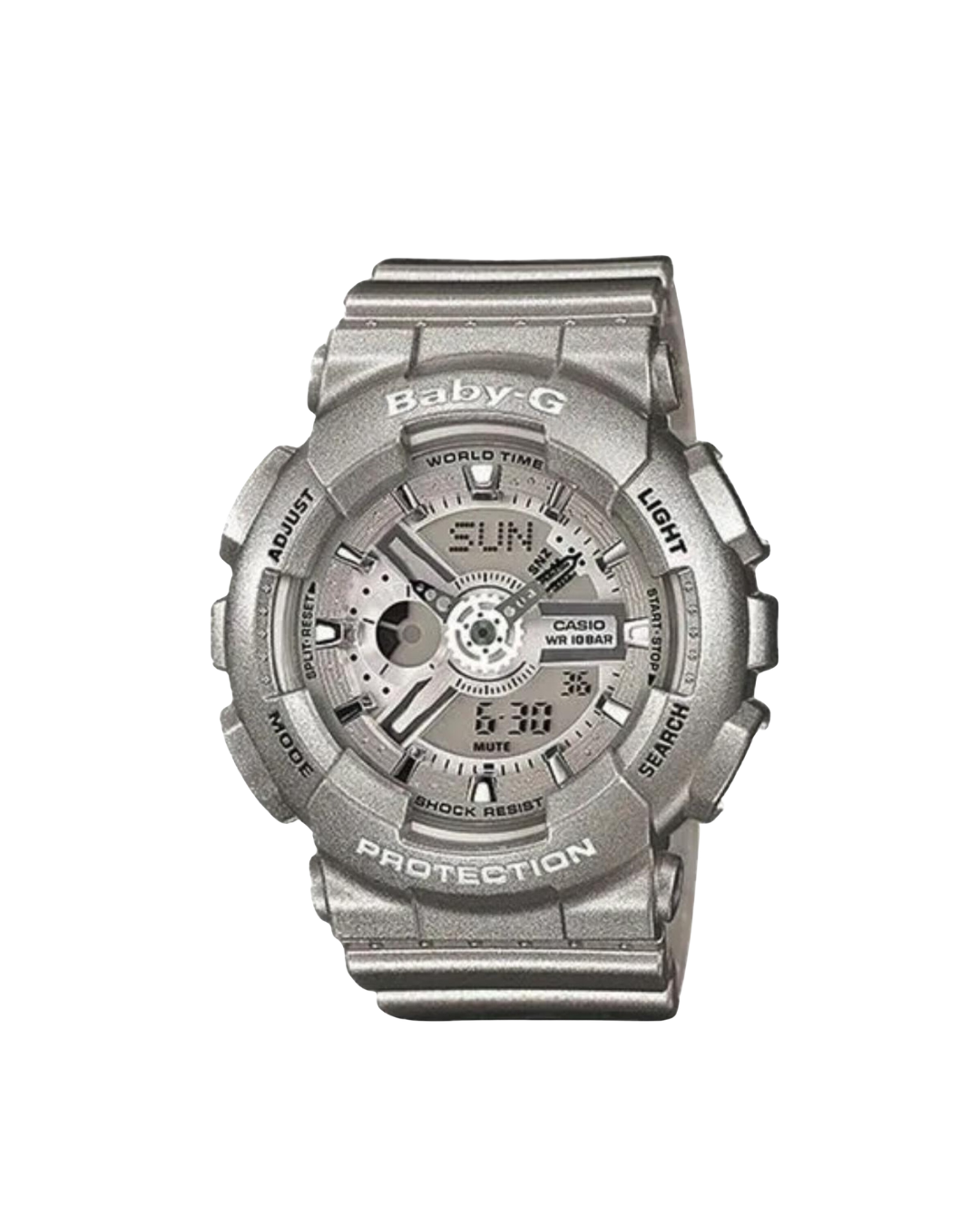 El Casio Baby-G BA-110-8A presenta un diseño deportivo en tonos grises con detalles metálicos que le dan un estilo moderno y versátil. Su estructura robusta de resina combina una estética urbana con un formato analógico-digital que integra manecillas y pantalla electrónica en un dial de apariencia dinámica.