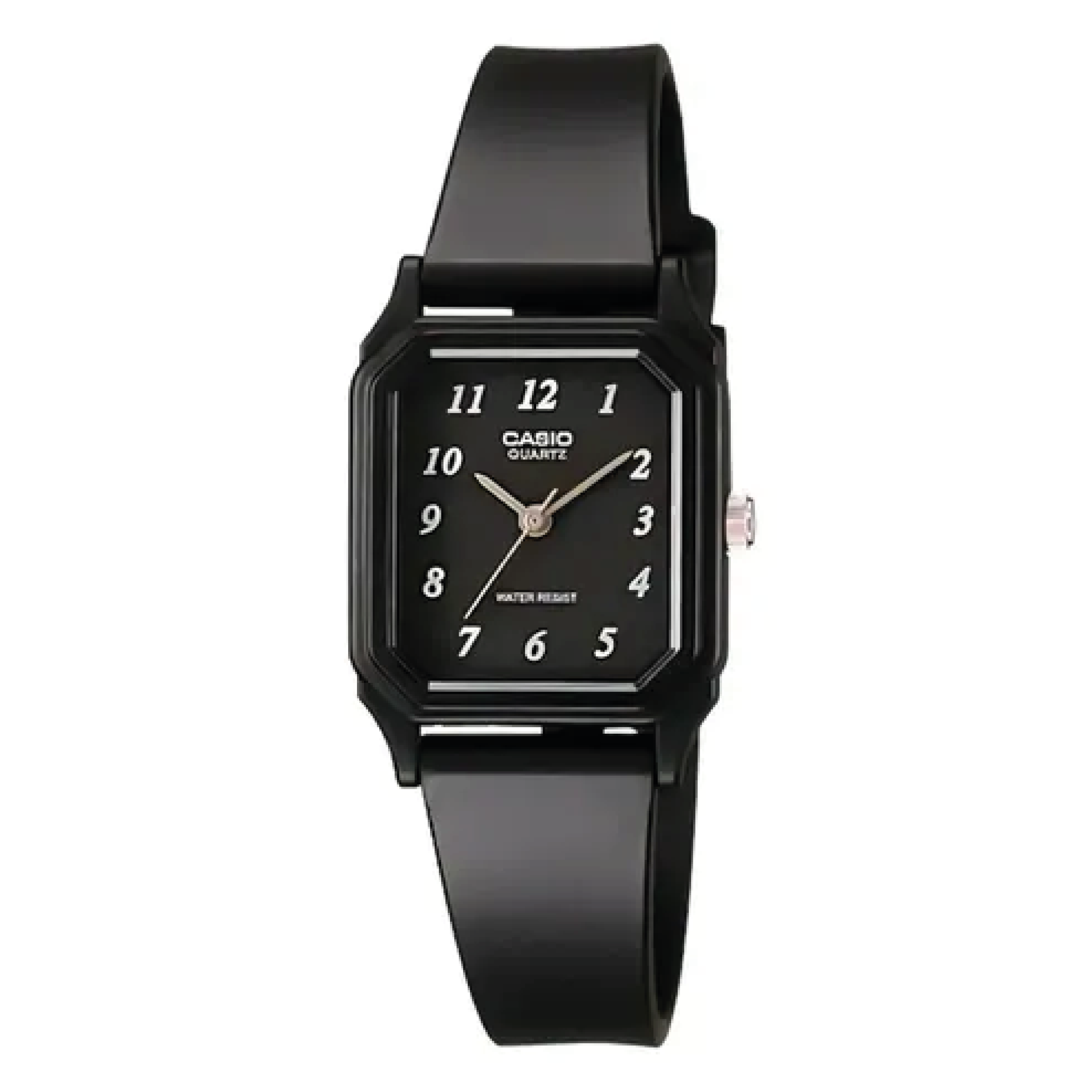 El Casio LQ-142-1E destaca por su elegancia estructural. Su caja rectangular de resina negra ofrece una silueta alargada que estiliza la muñeca, proporcionando un aire de distinción y orden. A diferencia de otros modelos, su esfera negra con números arábigos blancos y manecillas plateadas crea un contraste de “alto impacto visual”, permitiendo una lectura del tiempo rápida y sofisticada.