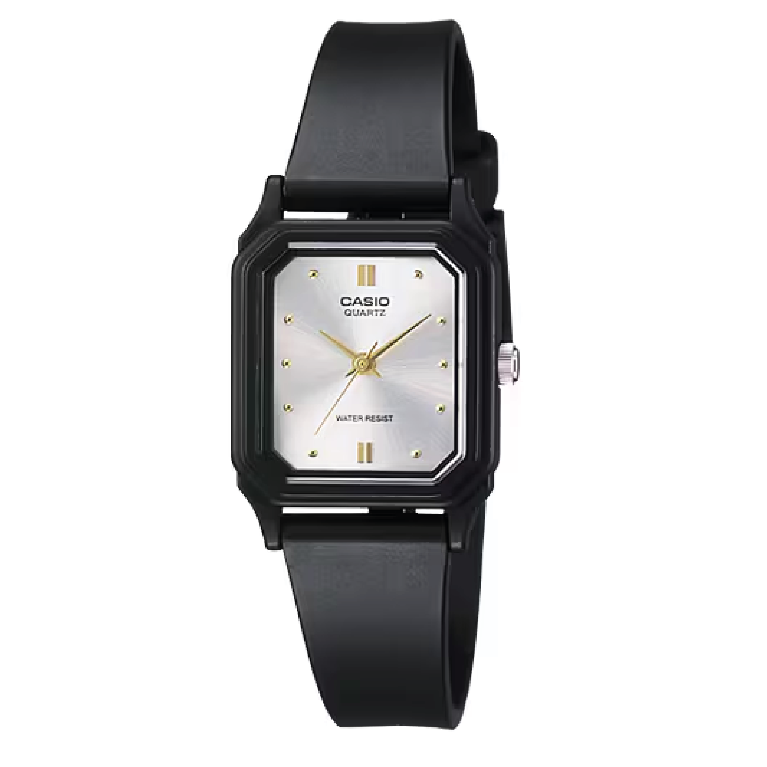 El Casio LQ-142E-7A destaca por su enfoque en el diseño puro. Su caja rectangular de resina negra enmarca una esfera blanca satinada, donde el verdadero protagonismo lo tienen sus índices plateados en forma de barra. Al prescindir de los números arábigos, este modelo adquiere un aire de sofisticación moderna que encaja perfectamente con la tendencia “Quiet Luxury” o lujo silencioso.