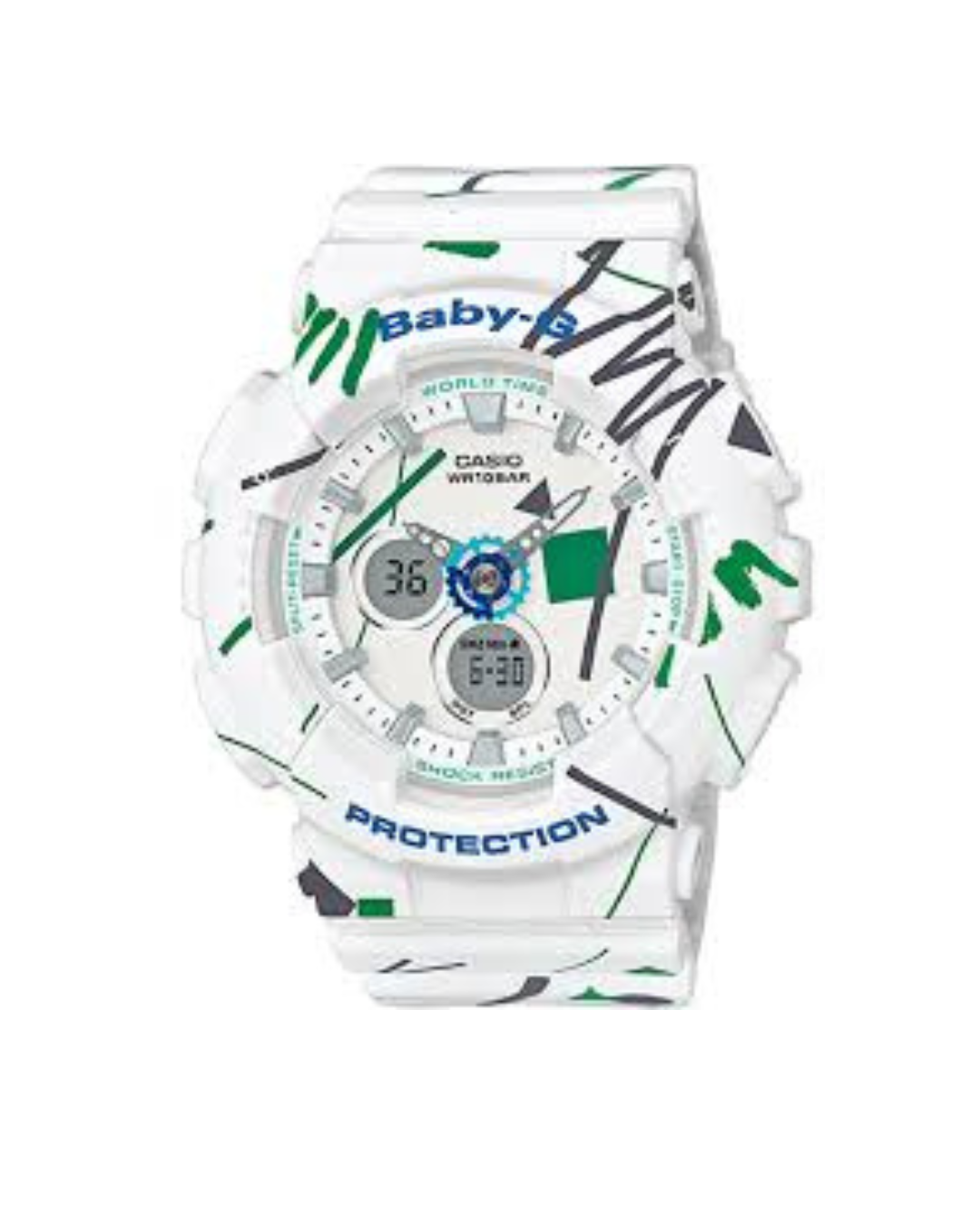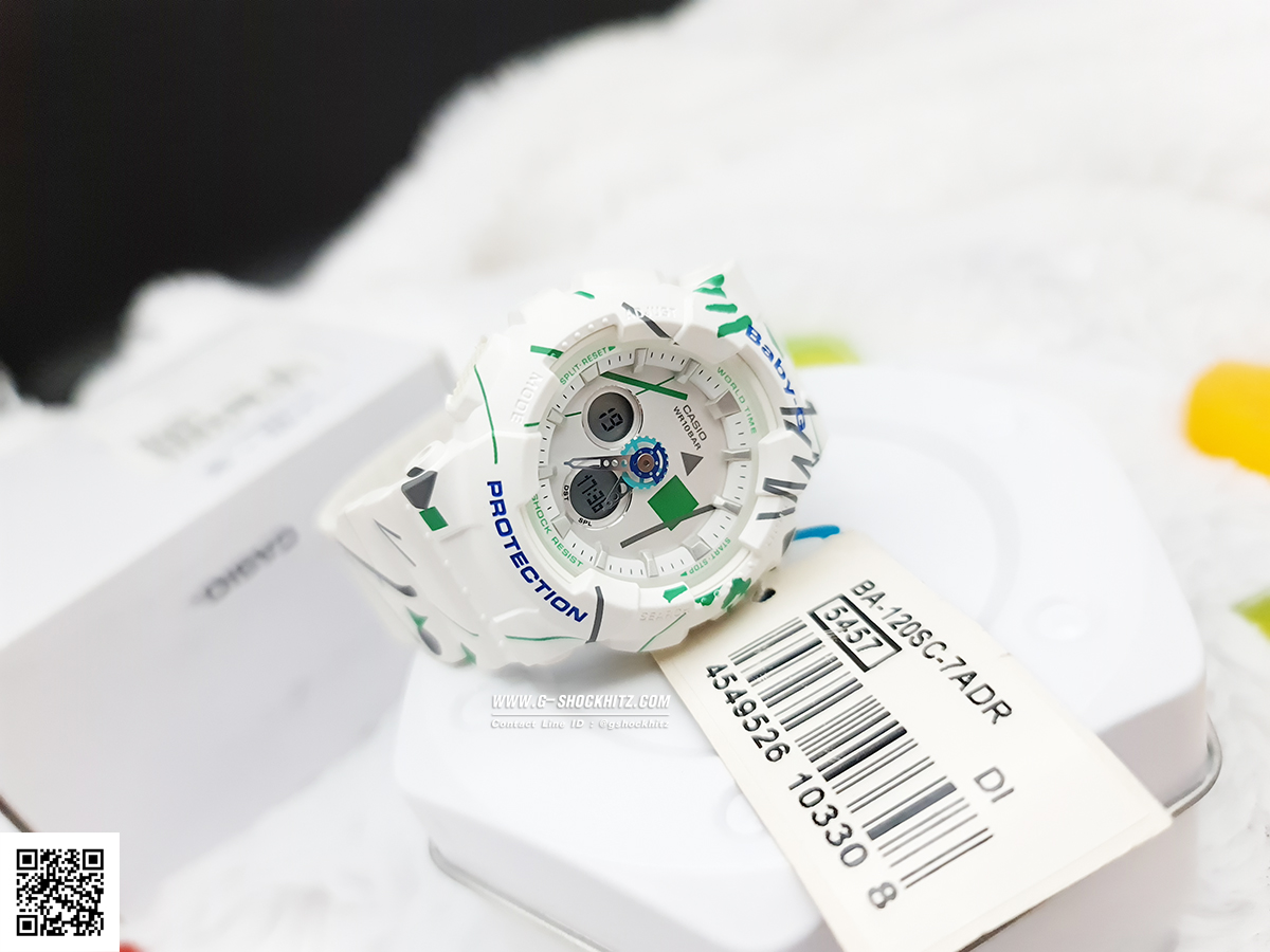 El Casio Baby-G BA-120SC-7A presenta un diseño deportivo en color blanco con un llamativo patrón tipo graffiti multicolor que le aporta un estilo juvenil y moderno. Su estética combina detalles vibrantes con un dial multidimensional que genera una apariencia dinámica y urbana.